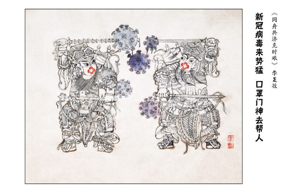 《同舟共济克时艰》第一幅新冠病毒来势猛,口罩门神去帮人。选取门神形象,寓意口罩就是我们的门神,戴好口罩就能做到最基础的防护;