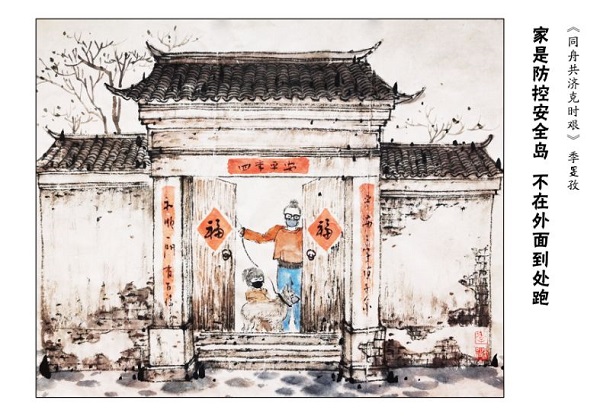 第二幅家是防控安全岛,不在外面到处跑。选取在江南老宅中,小女孩想带小狗出门遛狗,但是妈妈进行了阻挡,还是在家最安全;