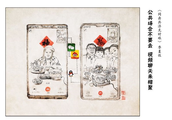 第三幅公共场合不要去,视频聊天来相聚。选取日常最常见的微信视频聊天的界面,建议百姓们还是不要外出;