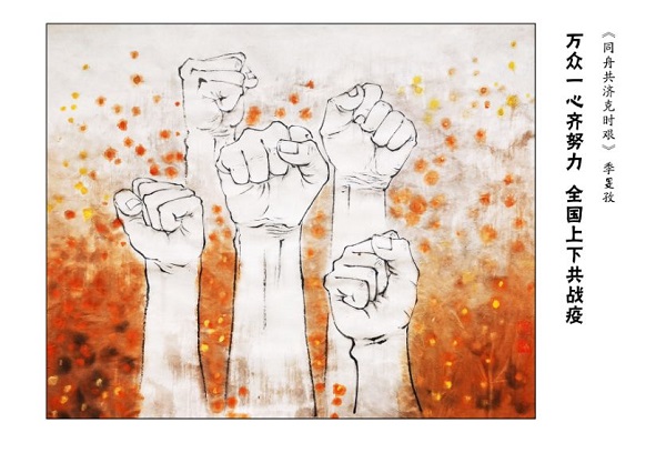第七幅万众一心齐努力,全国上下共战疫。用众多握紧的拳头表达众志成城抗击疫情的信心和决心。