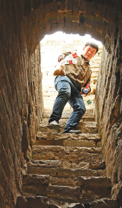 孙志伟在巡查长城时清理垃圾。马卫庆 摄
