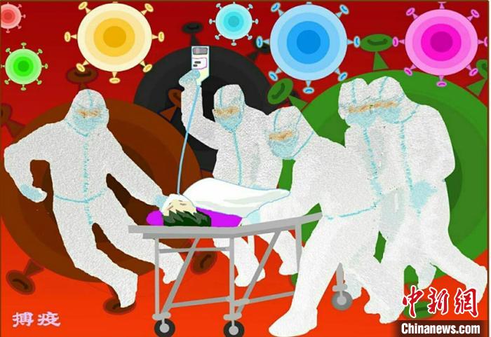 “整个作品从构思到形成用了5天时间。”卢凤霞说,她一直关注疫情新闻,画面上的医护人员、志愿者、运送物资的军车、拉载医疗队的动车都是从新闻里提取的信息。