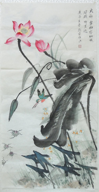 题款:莲性本自洁,天生不惧邪,遍洒甘露水,驱蟊佑中华