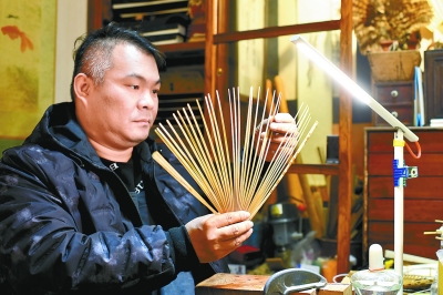 做扇时,年过不惑的徐广华喜欢一个人静静地坐在工作台前,有时一坐就是大半天。每一把扇子的完成,都是一次与时间的对话,沉静而专注,使得每一把扇子都尽善尽美,弥足珍贵。(李如意)