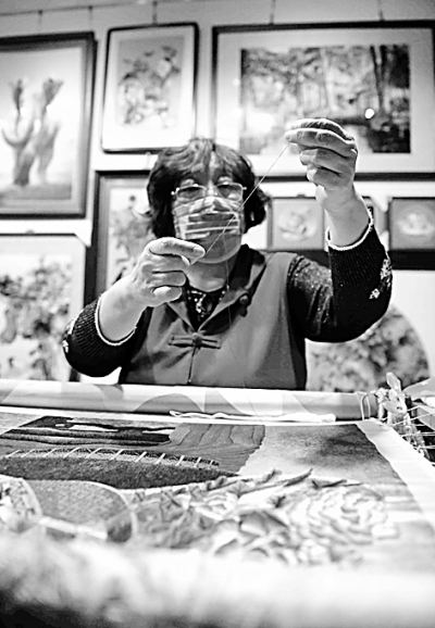图为4月16日,邢氏刺绣传承人邢兰芳在石家庄市长安区工作室内进行刺绣创作。新华社 发