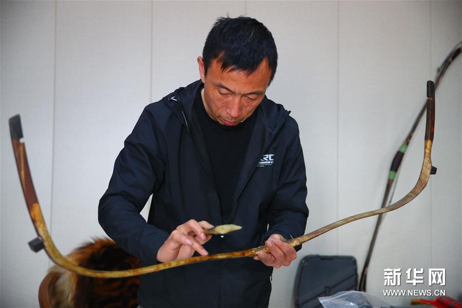 鄂建烨在测试一张弓的拉感(2019年10月28日摄)。新华社记者 龙雷 摄