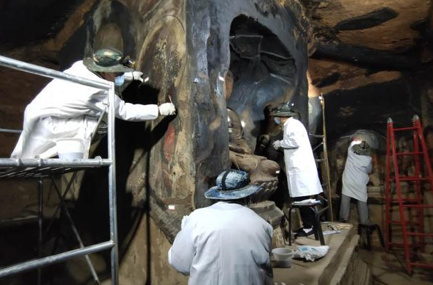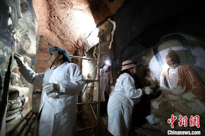 专家在宁夏固原须弥山石窟第48窟内对壁画进行修复。于晶 摄