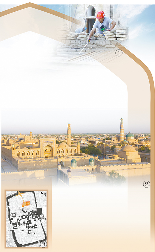乌兹别克斯坦西南与土库曼斯坦交界处,希瓦古城悄然屹立。希瓦古城,曾与撒马尔罕、布哈拉等同为中亚古丝绸之路重镇,有花剌子模地区保存最完整的古建筑群。1990年,希瓦古城内城——伊钦·卡拉(图②,影像中国)列入世界遗产名录。