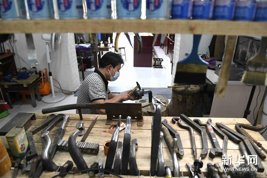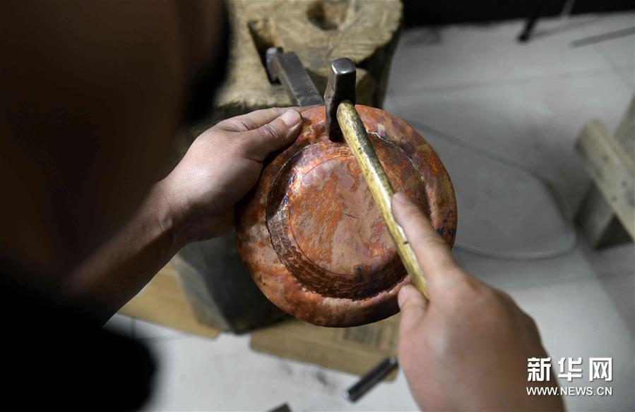 5月6日,在河北石家庄市新华区燕赵文化艺术市场工作室,民间艺人王建辉在进行金工冷锻造手工技艺创作。新华社发(陈其保 摄)