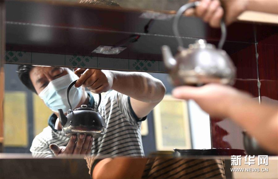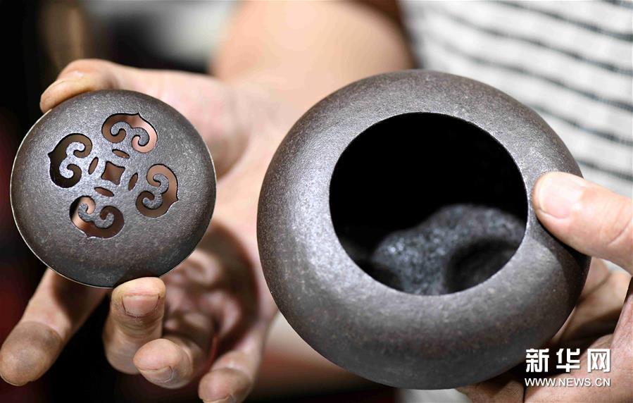 5月6日,在河北石家庄市新华区燕赵文化艺术市场工作室,民间艺人王建辉在展示制作好的成品。新华社发(陈其保 摄)