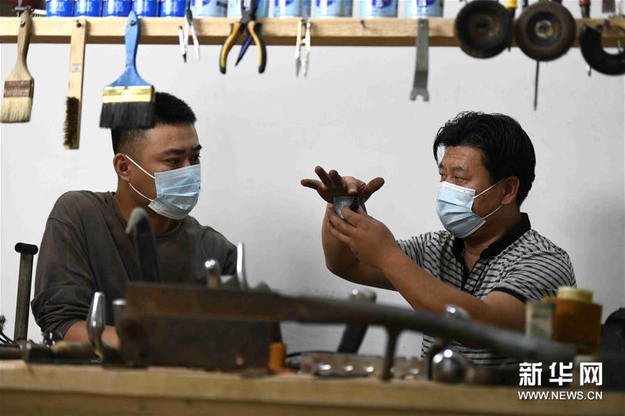 5月6日,在河北石家庄市新华区燕赵文化艺术市场工作室,民间艺人王建辉(右)向学员传授金工冷锻造手工技艺。新华社发(陈其保 摄)