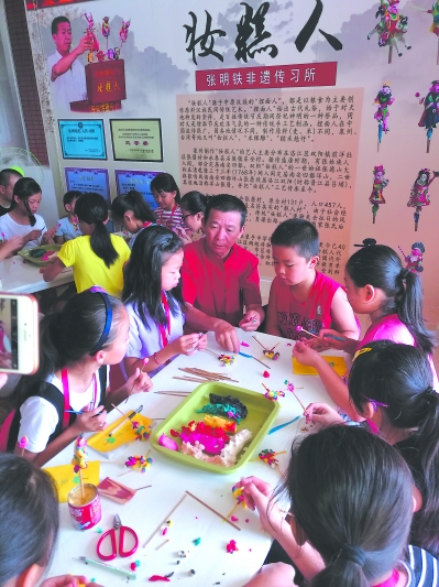 位于洛江区的“妆糕人”传习所,是泉州市首批非遗传习所,也是张明铁传艺的重要基地,不断有爱好者光顾。自2015年起,张明铁每年还会获邀到洛江区中心小学生综合实践基地,为孩子们上妆糕人制作课,为制作技艺的传承种下“希望的种子”。2017年,洛江区文化馆举办的暑期公益培训班,也特邀老张为孩子们带去欢乐。