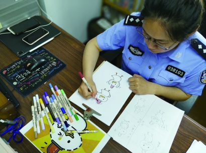 民警正在手绘“小鸭子”表情包