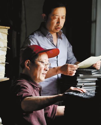 郑兴宝(左)、郑宗男父子在藏书楼内核对和校验雕版。吴建勋 摄(资料照片)