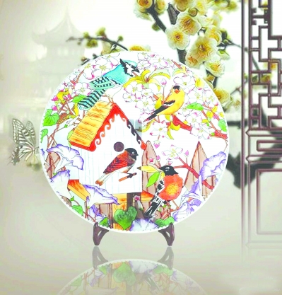 一幅玻璃画的诞生要经过10道工序,先用针筒挤上颜料描轮廓,而后用画笔填颜料,再用刀片一刀刀地将颜料推开……推颜料的过程很重要,要讲究画面层次、颜色的过渡,才能表达出意境。经过一系列复杂的步骤后方能进行烧制。