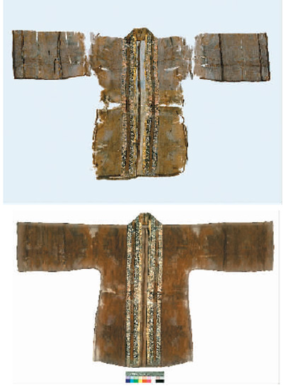 南宋紫褐色罗印金彩绘花边单衣修复前后对比图。配图由中国丝绸博物馆提供