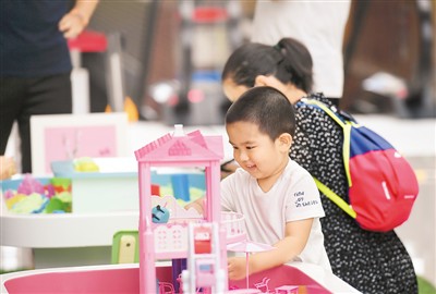 7月26日,位于天津滨海新区文化中心的廊桥文化市集开放,设有非遗记忆、手作秘境、特色美食等多个板块,吸引了众多游客。图为小朋友在廊桥文化市集内玩耍。