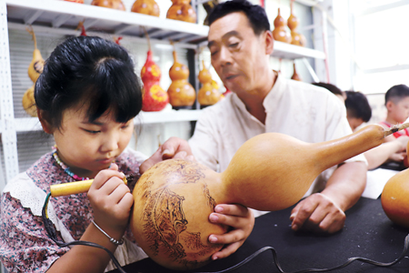 暑假期间,河北省邯郸市广平县平固店镇北吴村的十多名农村娃,在当地非遗葫芦烙画艺人龙常青的免费指导下学习葫芦烙画,丰富暑期生活。