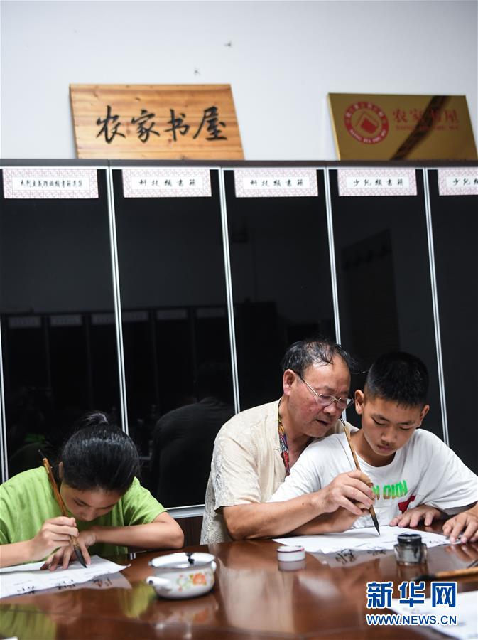 8月22日,在杭州市临安区湍口镇迎丰村的农家书屋内,村里的党员志愿者带领小朋友练习书法。 为了让孩子们度过一个有意义且安全的暑期,结合春泥计划系列活动,浙江省杭州市临安区湍口镇的党员志愿者利用乡村农家书屋为孩子们开设书法、国学等课程,让他们感受传统文化的魅力,同时也为乡村的孩子们打造了一个乡村暑期快乐课堂。 新华社记者 徐昱 摄