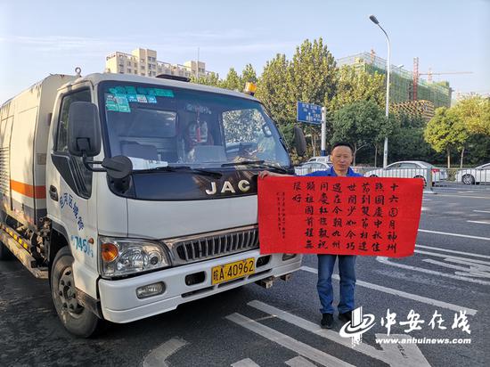 临近国庆、中秋双节,合肥环卫工人魏跃武挥毫泼墨,用书法表达对祖国、对人民的美好祝福。