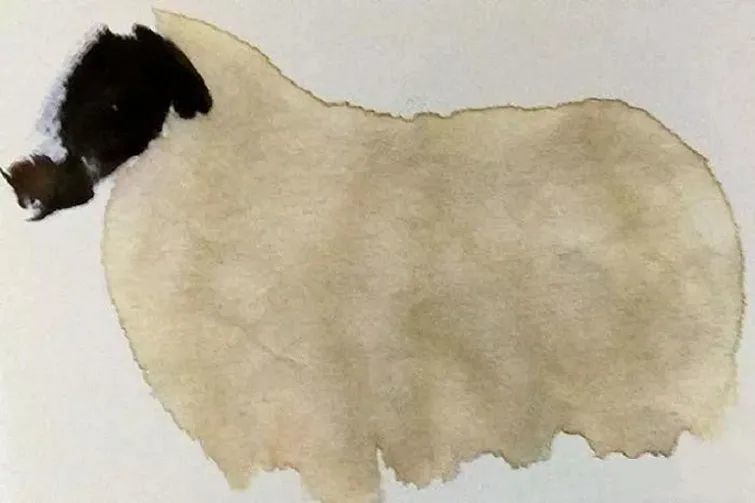 第五步:将笔毛压扁分开,以墨破色,顺着绵羊的体位勾毛。趁画面未干时,以矾水点撞下部,使形成卷毛之感。小笔收拾细节。最后整理,完成。