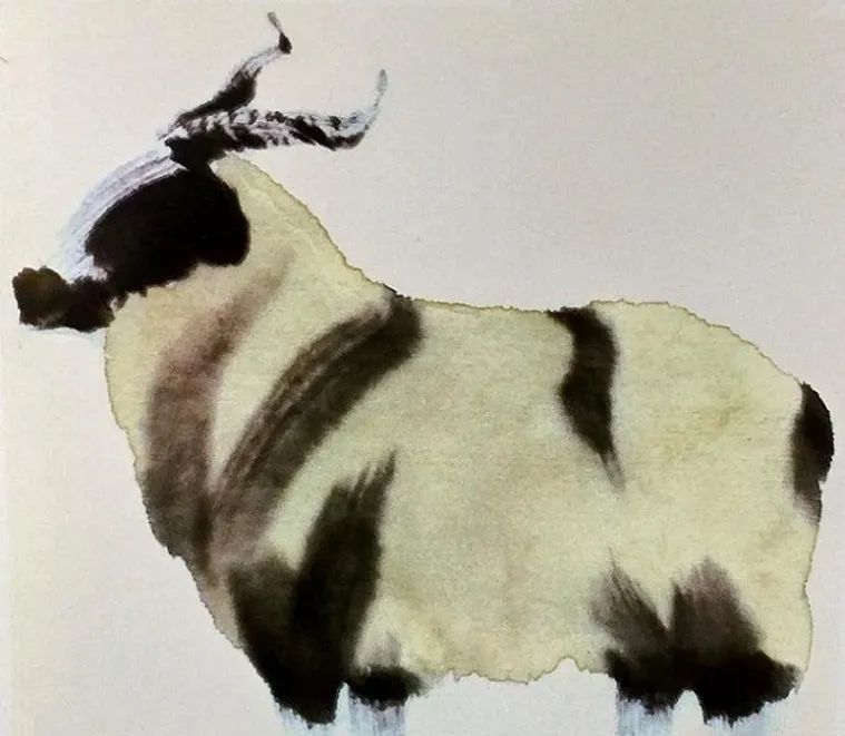 第三步:以浓墨画羊头和耳朵,以淡墨画嘴部,然后朱磦点鼻。