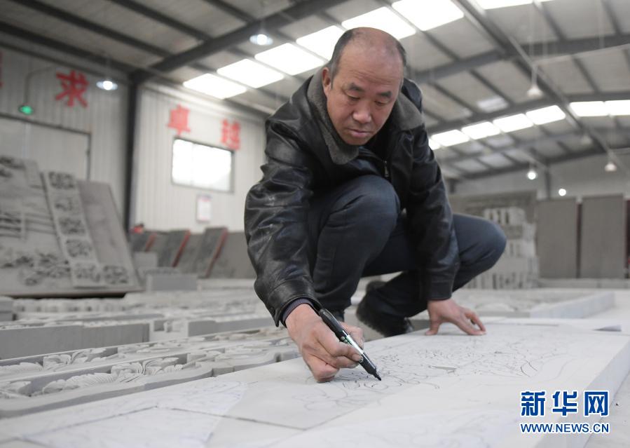 12月16日,在甘肃省临夏回族自治州临夏县一砖雕公司,工作人员在砖上绘制图案。