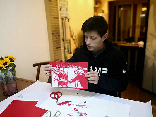 他的这幅剪纸作品顺利完成,取名《同舟同济,众志成城》,并及时拍照展示在了朋友圈,获得大家纷纷点赞。