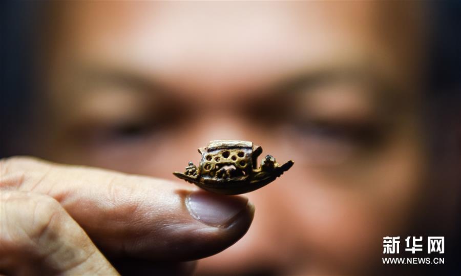 在台湾新北市新店区,陈逢显展示他制作的橄榄核微雕(7月18日摄)。新华社记者 薛玉斌 摄