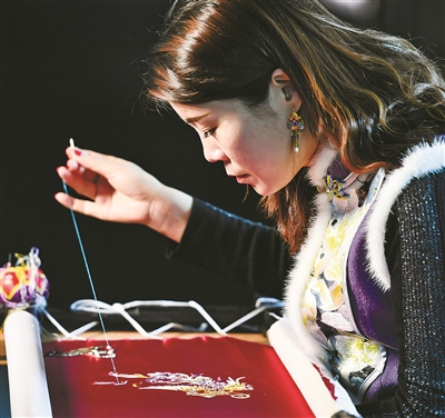缪素青在真丝缎上创作刺绣作品《凤穿牡丹》。(严龙 摄)