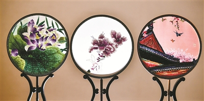 缪素青设计、制作的双面绣团扇。(严龙 摄)