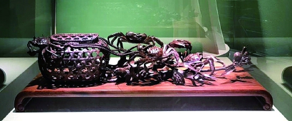 喻立新的写实仿生代表作紫檀木雕《蟹篓》等多件作品不久前在刘海粟美术馆分馆展出,受到观众热情点赞。在位于嘉定区的喻立新大师工作室内,我见到了紫檀雕《蟹篓》,这件作品在2019年10月举行的“长三角工艺美术精品展”优秀参展作品评选中荣获金奖。整件作品长度是60厘米,篓宽16厘米,但见四五只肥硕的螃蟹被送入竹篓后,又争先恐后地爬了出来,无奈腿脚相缠拥挤到了一起,有一只活络的已爬到篓底部,在拴篓的绳子上还有几串稻穗。作者将螃蟹在篓外相互挣扎的瞬间姿态、刻画得栩栩如生,达到了呼之欲出的艺术效果。再看那蟹篓,“竹条”经纬分明、缝隙间距大,十分细腻逼真。
