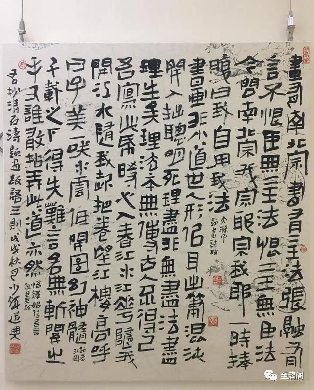 此次展览展出韩少辉先生新近创作的书法作品四十六件,既有擘窠大字,又有方寸小品,既有混合临摹数帖于一纸的临作,又有用笔变化、笔墨情趣件件不同的创作,还有篆隶杂糅的新品。作品既表现出作者整体风格的一以贯之,又在内容、形式、尺幅、设计方面增加了展览的丰富性,具有很强的观赏与研究价值。