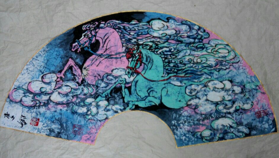 我们知道宣纸是中国的文房四宝之一,它渗水、渗墨,而中国画又讲究墨分五色,追求水墨的变化以及色画效果。所以说彩墨画的视觉效果截然不同于油画,特别的有意思。彩墨画其实还是归类在中国画里面,我从事这种创作有二十几年了,一开始都是探索式的小幅作品,逐渐再到大幅的。这种画法从开始的构思、立意,到勾画草图、修改,再到放稿、着色、做效果,最后收拾整理,整个过程比较漫长。因为创作起来非常麻烦,所以我通常都是有整块时间才做。彩墨画的缺点是没有什么虚实和空间,所以我希望能够把其中的线、面、色彩有机融合起来,展现出我想达到的装饰美感。同时我又从钧瓷和民间蜡染、扎染中吸收灵感,把开裂的肌理效果和民间艺术的独特味道融合进画面中,使它既具有现代元素所带来的现代美感,又有民间元素所带来的传统渊源。根据这种方式我创作过几幅大尺幅的彩墨画,效果都非常好,并且具有独到的韵味。