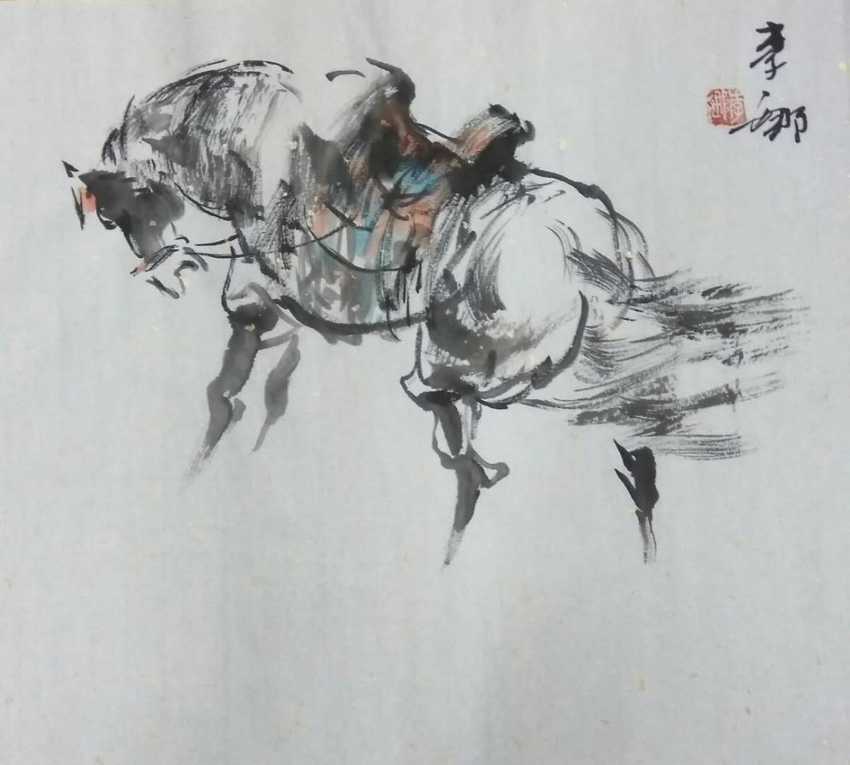 除了彩墨画这种创作类型,我对于国画中写意马的创作也有所见解。马是中国人都非常喜欢的一个主题,从古至今许多吉祥的词语里都有马,比如马到成功、一马当先,给人一种奋发向上、朝气蓬勃的寓意。同时马本身的变化非常多,形态非常丰富。因此我潜心研究过徐悲鸿先生的马,我在他的墨马基础之上,增添了一些颜色,并且从形式感上试图追求一种新的面貌。我特别喜欢马那种多动的、丰富的变化,如果我眼前看到了一匹真正的马,我就有一种想画的冲动。我买过不少关于马的结构和性格方面的书籍,希望能够从中捕捉到它的运动规律和结构特点,然后适当的给予夸张变形,最终形成属于我自己的独特面貌。虽然它的难度比较大,尤其是形不好处理把握,但这是我追求的一个目标。