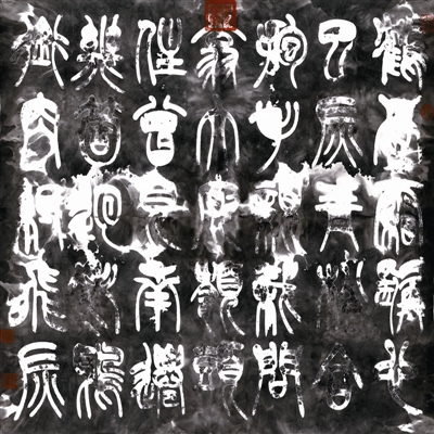 其实,韩祖耀学书法视野宽广,近四十年的临池不辍,先后临习过汉隶、唐楷以及明清诸子,对王羲之《十七帖》、颜真卿《颜勤礼碑》《祭侄季明文稿》、孙过庭的《书谱》尤为用功。尽管韩祖耀平时多以古奥的篆书面目出现,他的行楷书迹,不时可以从西湖、湘湖沿岸匾额上看到,而且,他也尝试过宿墨、涨墨效果明显的现代书法,虽属偶尔为之,作为篆书以外的一种体验,浸淫着书家对艺术长久的思考与感悟。