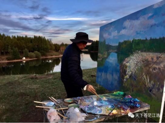 而这些天,范迪安老师一直在6米长的画布前不停地思考呀,画呀,一天站了十多个小时,来回走动了几万步。为了节省午饭的时间,他就在面包车里泡盆方便面。实在累了,就用防寒服盖住头眯一会儿,然后继续投入工作。在北曼甸营林区旁,在泰丰湖岸边,每天从早晨七点半一直画到晚上七点多,冷风把脸都吹得红紫。他只是说:“我们现在的生活工作条件多好呀,想想当年,塞罕坝建设者的生活有多苦。我们要学习他们的精神,宣传他们的业绩,让子孙后代记住他们的贡献。”