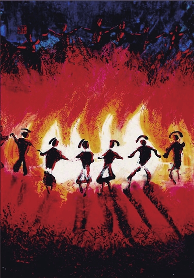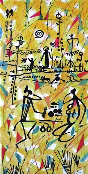 印象岩画?印象在哪里?这得从他的作品说起。张学智告诉记者,自从被岩画的魅力折服后,他就放下工笔画方向,潜心研究岩画。他从岩画中获得灵感,创作有反映太阳崇拜、祭天、狩猎等远古人类生产、生活的场景,也有洪荒天地、野林古风、混沌初开等画面,呈现出神秘、诡谲、浪漫的艺术特点。比如《太阳崇拜》《天祭》《圣火》《猎射图》等等。这些作品表现出一种混沌的、虚幻的、复杂难言的意象世界,具有强烈的超现实风格。将“远古”与“现代”、“历史”与“文化”、“具象”与“抽象”相融合,这就是“印象岩画”。