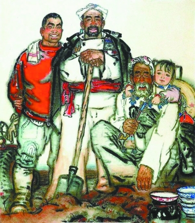 1958年,刘文西来到西安美术学院任教,从此他开始了以人民生活、革命历史和黄土地为题材的绘画艺术生涯。四年后,刘文西以水墨画《祖孙四代》一举成名,这幅画和《毛主席与牧羊人》一道奠定了他的黄土艺术风格。