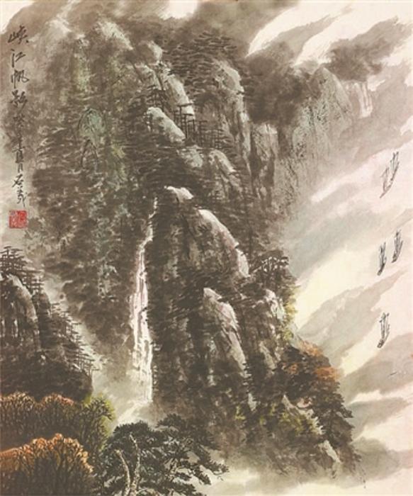 中锋运笔、墨色浓厚、山体厚重乃石义先生作品一大特点。《风生水起》以中锋表现树木的挺拔不羁,用积墨使树山一体以突出山体厚重,以泼墨表现雨后云雾飘渺。纵观整幅作品,山势峻伟,连绵不绝,深远辽阔云蒸雾绕,非大手笔不能为之。《雨后山更青》画的是夜雨初霁、雾气迷漫的山谷清泉。丛林浸在湿润中隐隐约约,使人不由想起王维 “山中一夜雨,树林百重泉”的诗句来。《暮色苍茫》画面纹理富有新意,前景为苍劲刚健错落有致的老松,背景为郁郁葱葱的青山与奔涌不息的流云,分明是君临天下群山来朝,使人明显感受到画家对大自然的热爱与极富创意的探索精神。