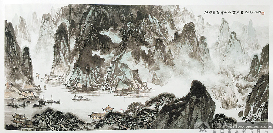 《青罗碧玉图》中的漓江,画面视野宏大,气势雄浑,近山屏立峭拔,古木萧疏;远峰云雾迷濛,苍润蓊郁;中景则以大写意泼墨法写就,任水墨色彩在画上渗化流动。这无疑是广西山水画的代表作之一,也是漓江画派的扛鼎之作。