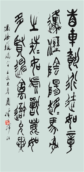 不久前,天一阁举办“周律之书法篆刻捐赠作品展”,汇集了50余件周老近几十年来创作的书法篆刻精品,其中几件临石鼓篆书作品极为亮眼,线质厚重中不乏轻松,字形端庄中寓飞动,形质与神采俱佳。甬上书画大家贺圣思先生对此极为赞赏:“猎碣临作拜读,相当精彩,把诏版笔意融入石鼓,既得雄浑之气,又有灵动之致;既脱缶翁窠臼,又出前人之新,自有一股清新气息。”