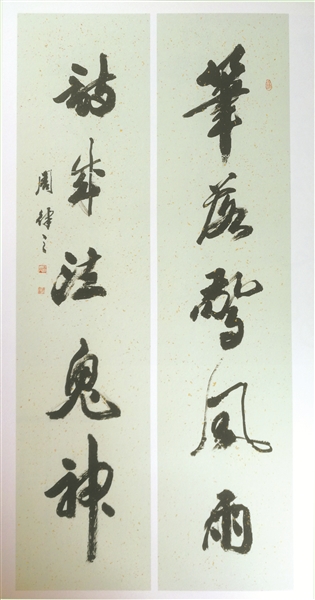 艺术创新是一个永恒的话题。周老书法几十年来一直在探究和求变,无论行书、行草书还是篆隶,由以前相对厚重沉郁的粗线条,逐渐演变为线条粗细变化十分明显,粗则极粗,细则精细。风格上,由原来的浑厚郁勃,发展为厚重中显灵动,雄浑中见秀美,平整中寓变化。同时于墨色求变化,涨墨、浓墨、飞白,甚至与淡墨互相融合。章法上,有时大疏大密,大开大合,可谓“疏可走马,密不透风”。这种求变、创新的探索精神,对一位年高岁迈的老书家来说,是难能可贵的。