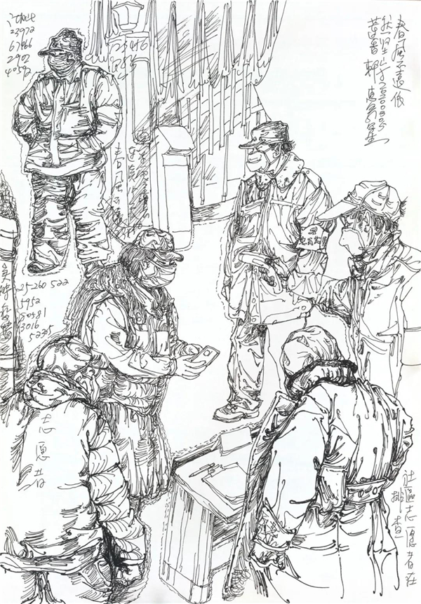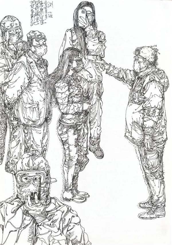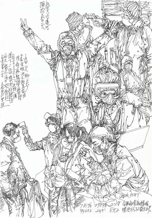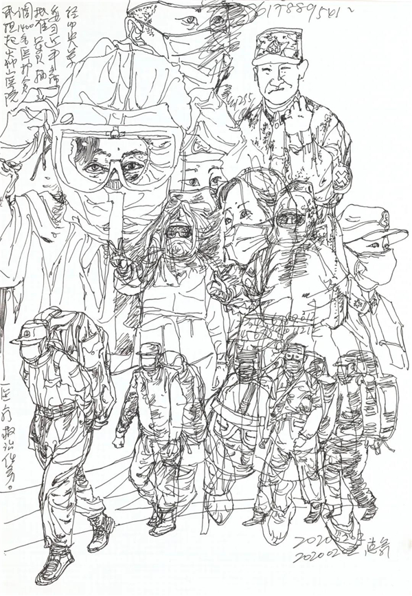 “生命重于泰山”,“疫情就是命令,防控就是责任”,一场十四亿中国人民团结一心的抗疫战斗正在湖北、武汉,正在中国大地悲壮地进行着。我和大多数中国人一样身居斗室,在经历了惊愕、痛苦、悲愤、又万般无奈后,开始冷静思考,开始想着还能做些什么?借助于高度发达的信息传送,我在家里每时每刻通过手机关注“疫情”变化,翻查每日更新的疫情通报,密切关注这场没有硝烟的防控疫情阻击战的进展情况。每天确诊人数上升的数字像是冰凉的利剑刺透我的心,同时又看到医务人员、解放军战士逆向而行在一线与疫情肆虐抢时间、争速度的比拼,还有很多普通人在社区、村头值班查岗,更有许多志愿者、普通老百姓自发为医院、守岗者送物资、送热粥……总有一些故事悲壮又令我感动!于是我开始以绘画日记的形式做一些记录。