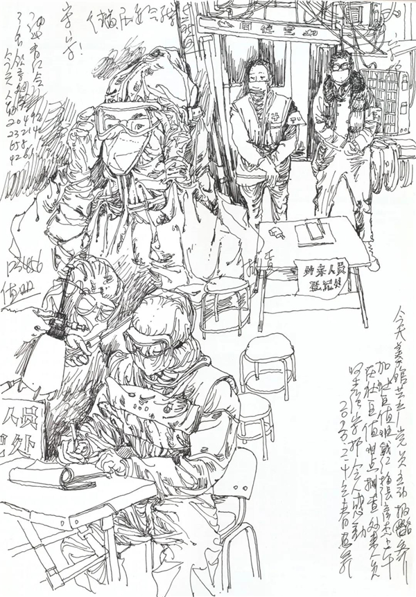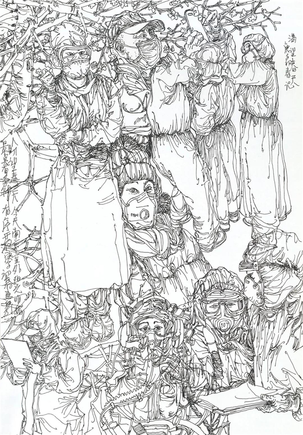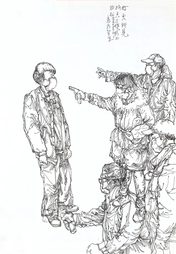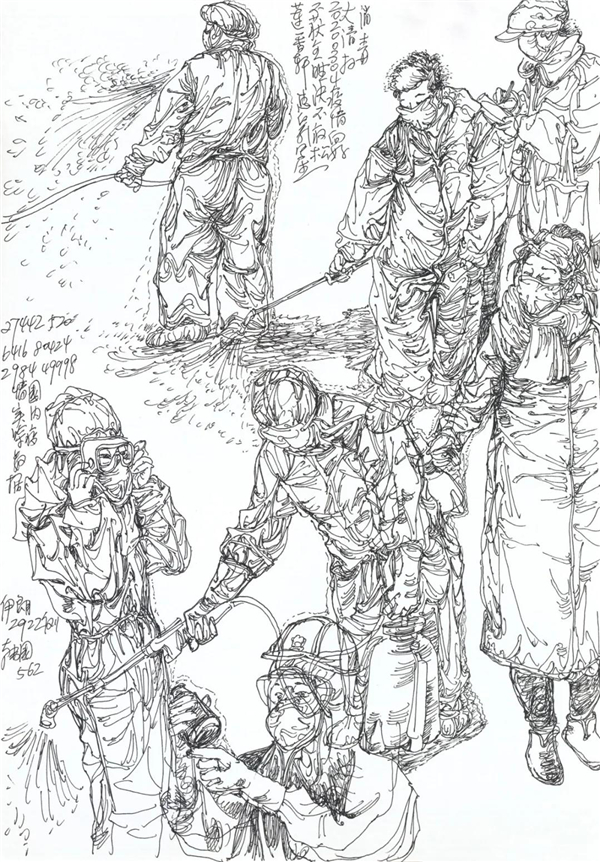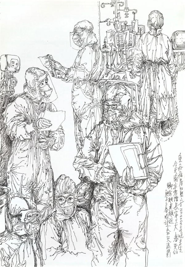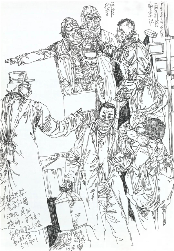 我也关注到在网上出现的对大量画照片,画钟南山肖像的作品的质疑,由于现在传播方式的简单快捷,目前呈现给我们的创作情况确实是良莠不分、水平差错,尤其有大量业余作者的积极参与,其图像未能如专业画家那般精彩,但尽管如此,我看到的却是在疫情面前广大美术工作者、美术爱好者,在这样一个特殊时期的特殊的“心声”表达,水平如何不重要,我分明看到的是由丹青凝结的抗疫力量。当然,对于专业美术创作者的主题性创作,我们还要更多的沉淀与积累,还要更多的思考,需要作者置身于宏大的时代思想气象中,以更高的站位、更宽阔的视野,来审视和分析疫情、时代和人性。就我本人而言,我的这几则日记显然不是经过充分营构的图式,也不是多么了不起的“大制作”,我也不是为了发表而创作,我曾经这样说:“纪录是为了铭记,为了不忘却”。