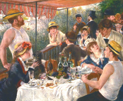 1869年的夏天,雷诺阿与莫奈常去巴黎郊外的一个游船胜地画塞纳河的风光。这两个月里,他们都开始使用宽大的笔触来捕捉瞬间的场景,巧妙地描绘水的自然荡漾和对光的反射效果。可以说,他们在此播下了印象派的种子。雷诺阿与莫奈有时几乎描绘了相同的场景,但两人的画作都表现出各自鲜明的个性。雷诺阿更侧重于描绘场景中的人物,渲染的气氛也更加明朗。
