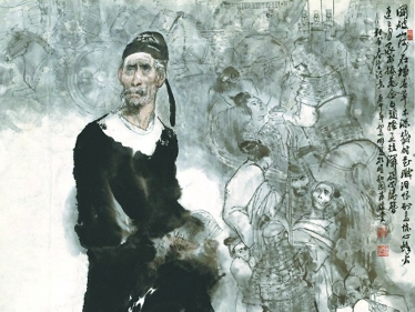 1980年,他以杜甫名诗《春望》为题材,创作了历史人物画《杜甫》。在遵循传统创作程式的基础上,他通过蒙太奇手法,在杜甫的主要形象之外,根据自己对诗篇的意境和理解,加入了次要人物群像作为画面的一种背景。