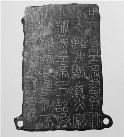 秦《诏版》亦称“秦量诏版”,青铜制。秦始皇统一中国后,进行了统一度量衡的工作。他采用了商鞅变法的政策,在标准器上加刻诏书,颁行全国作为标准。