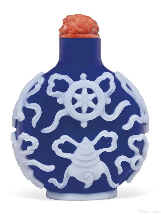 拍品编号642 1760-1820年蓝地套白玻璃雕八吉祥鼻烟壶 高6 cm 估价:美元 12,000 - 15,000