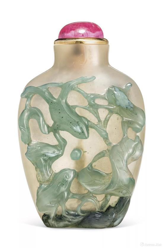 拍品编号703 1760-1800年玉髓玛瑙雕莲塘图鼻烟壶 高5 cm 估价:12,000 - 15,000